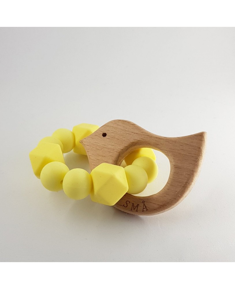 Deze mooie bijtring heeft kralen gemaakt van 100% food grade siliconen en een een ring in de vorm van een vogel van onbehandeld beukenhout.