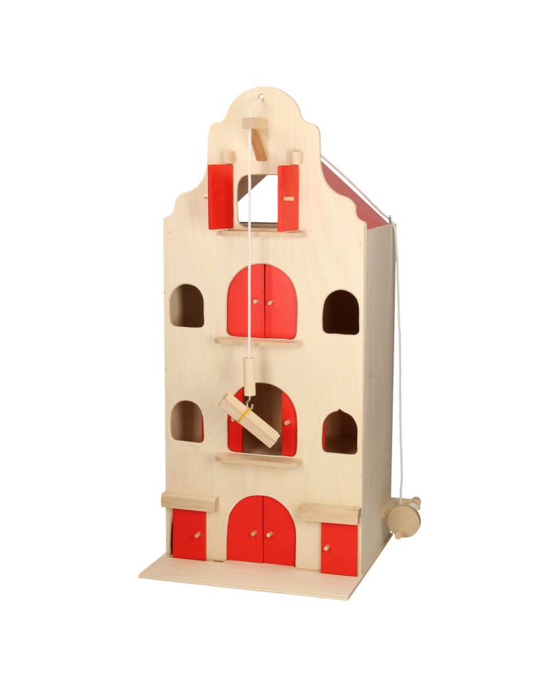 Dit Houten Pakhuis is ideaal te gebruiken als poppenhuis. De achterkant van het pakhuis kan geopend worden zodat je op de plankjes diverse meubeltjes en poppetjes neer kunt zetten. De rode deurtjes en raampjes kunnen open- en dichtgeschoven worden. Door middel van een katrol kunnen de bijgeleverde balken omlaag- en omhoog vervoerd worden. Het pakhuis is gemaakt van stevig kwaliteitshout en heeft maar liefst een lengte van 68 cm.